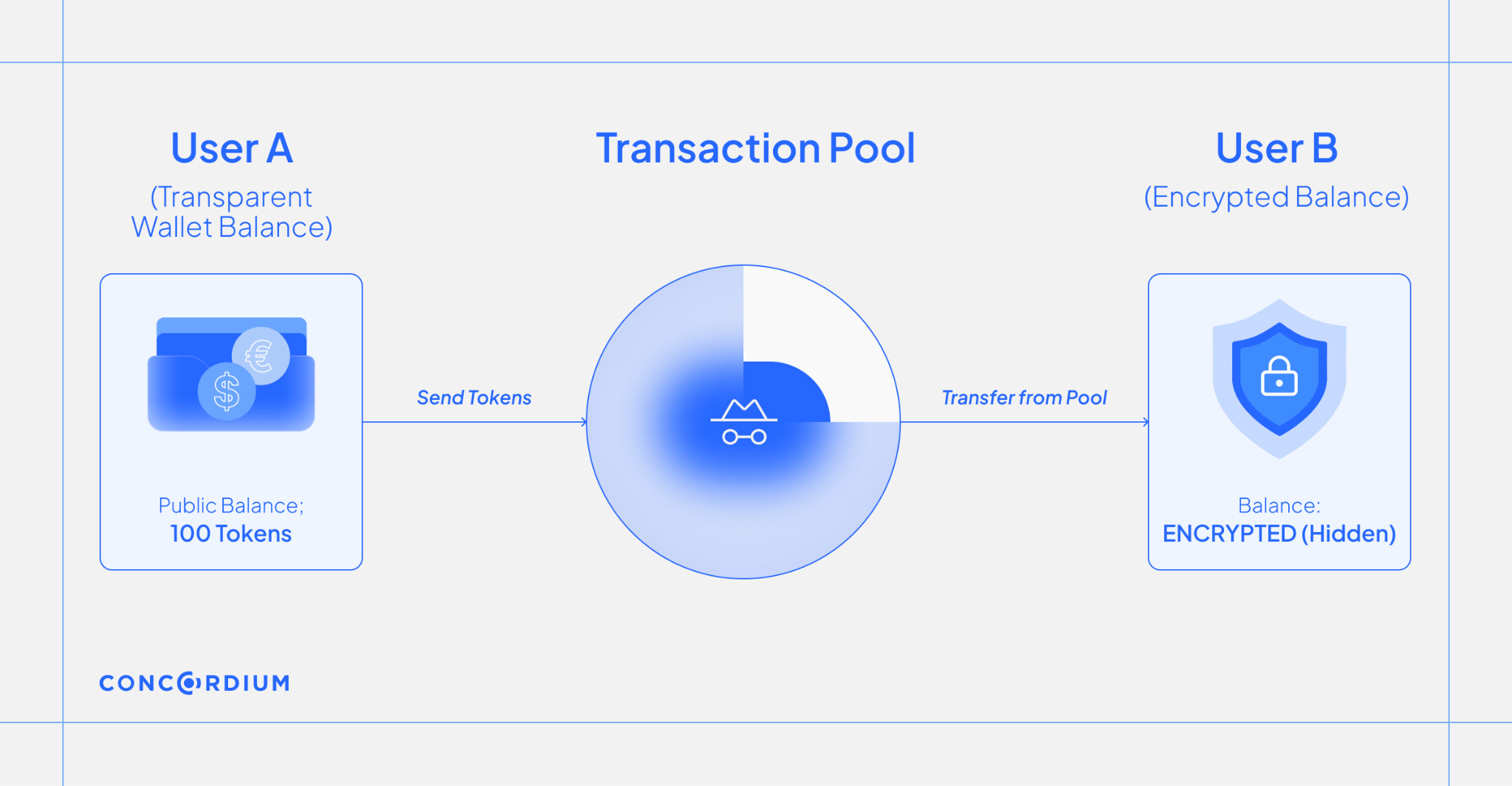 User A (transparent balance) can shield their transfer to User B (encrypted balance) → User A sends the tokens to a transaction pool, which makes the tokens mix with other assets. User B receives the tokens from the pool, but since the transaction and the balance are encrypted, this is not easily observable for a regular blockchain activity tracker.